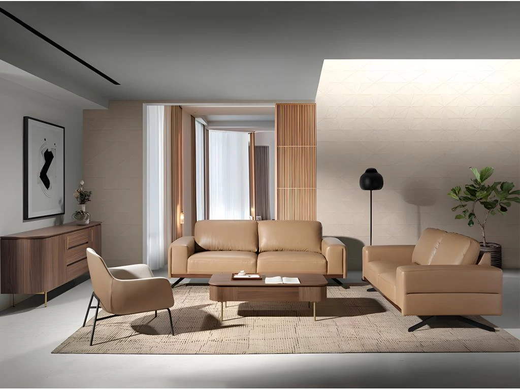 - DÉCORATION ET CONFORT: Grâce à son design original, combinant le cuir de vachette couleur sable, le bois couleur noyer et les pieds en acier noir, vous obtiendrez la touche différente et distinctive que vous recherchez dans votre coin détente.