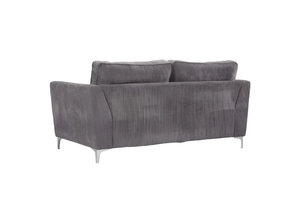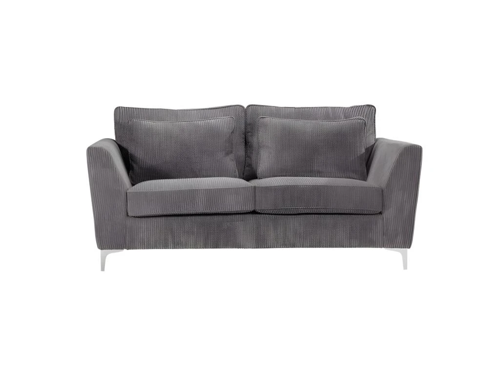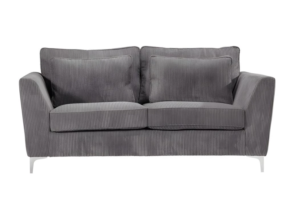 Canapé ISLA Ses points forts : grandes dimensions et grand confort. Canapé fixe 2 places. Mousse haute densité 30 kg/m3. Tissu en velours cà´telé épais 380 g/m ², 100 % polyester, coloris gris. Structure en bois massif (pin) et fibres de bois (MDF). Assise : mousse PU haute densité 30 kg/m3 (12 cm) sur sangles élastiques. Dossier : 2 grands coussins + 2 coussins plus petits, déhoussables garnis de fibres de silicone. Pieds métal à monter soi-même. Dimensions 183×96 cm, hauteur 93 cm. Poids 55 kg.