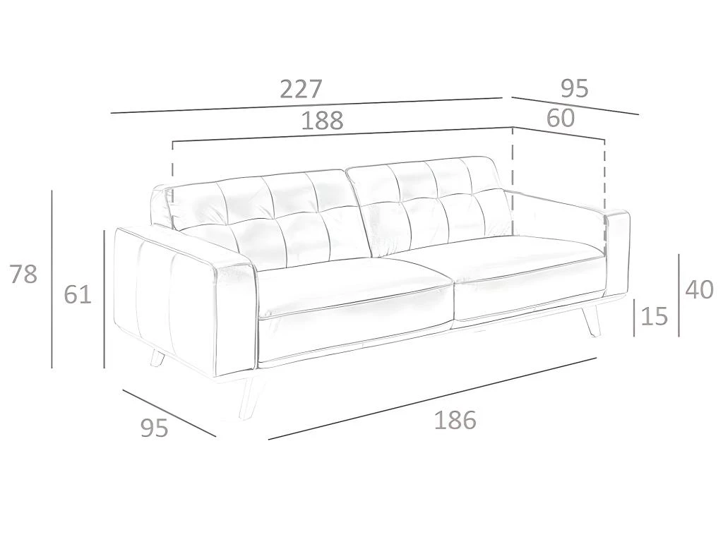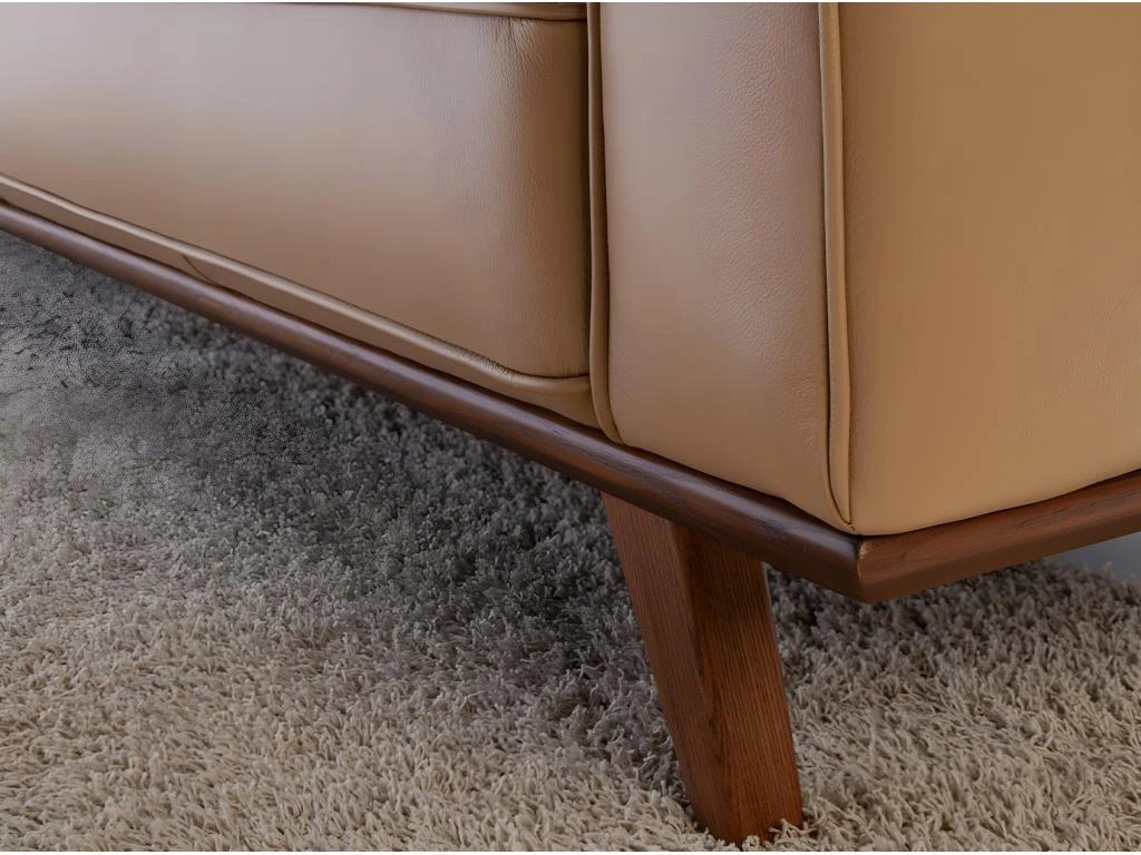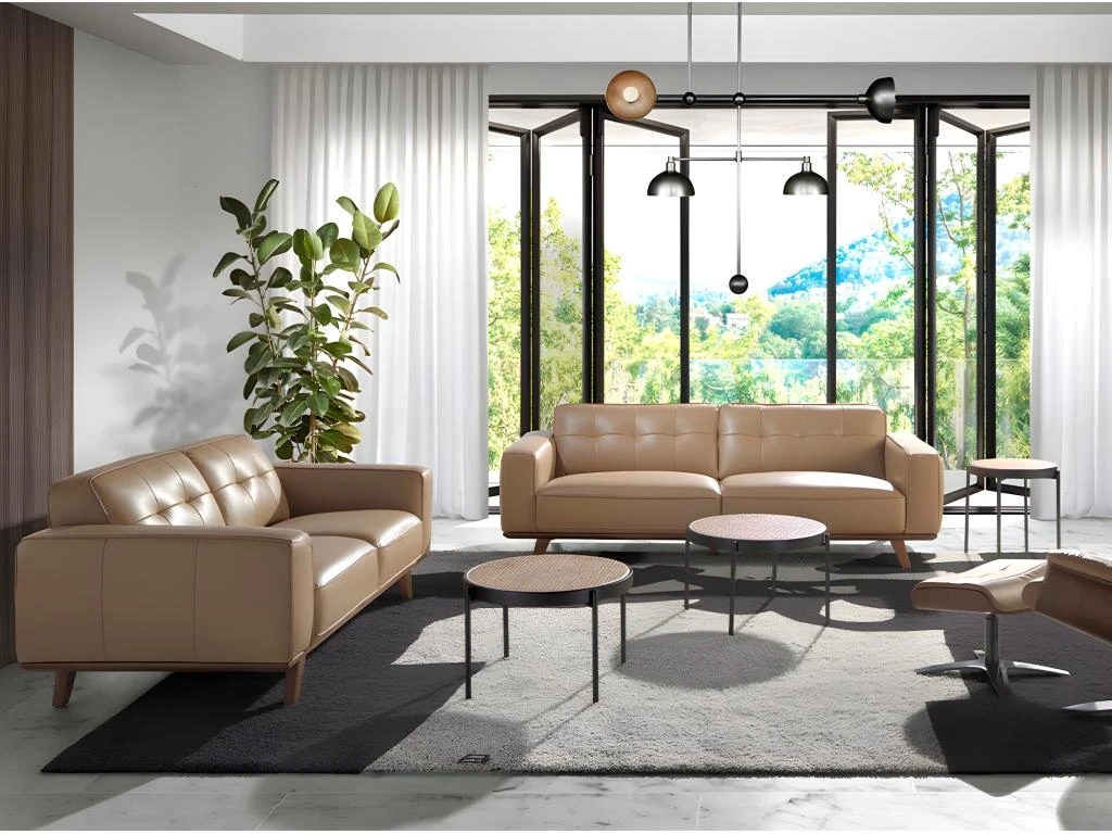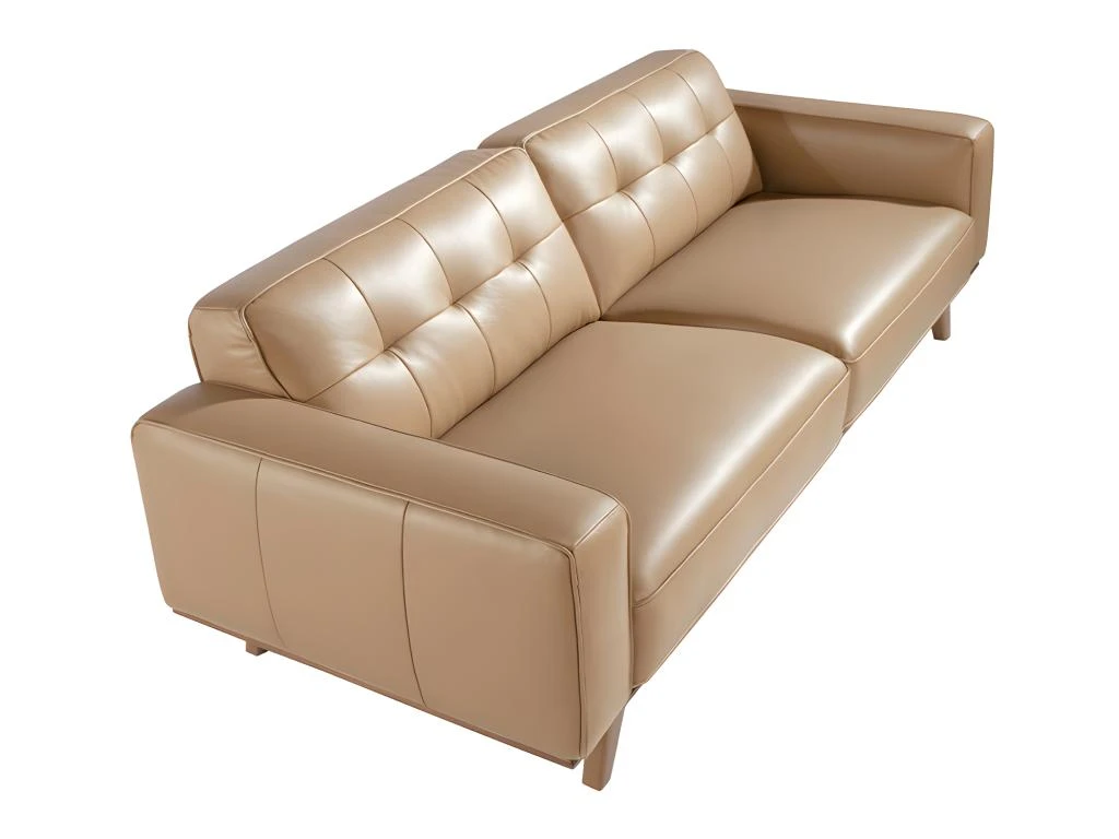 Canapé 3 places de design moderne tapissé en cuir de vachette de 1,5mm d’épaisseur de couleur sable, avec effet capitonné dans le dossier. Un canapé qui combine la qualité de nos cuirs avec le style de notre marque. La combinaison de sa structure interne en bois de pin naturel et de la mousse de polyuréthane de 20 kg/m3, vous offre le confort supplémentaire dont vous avez besoin pour vos heures de repos. Sa structure de pieds en bois couleur noyer caractérisera votre salon avec un style élégant et avant-gardiste