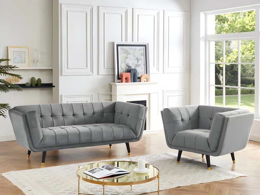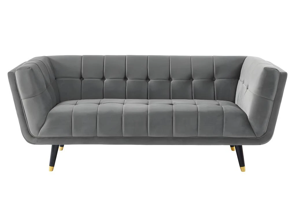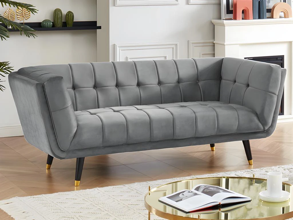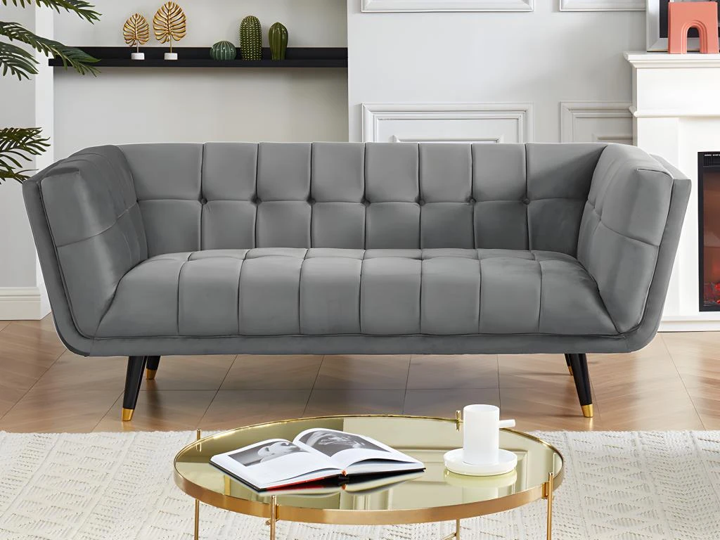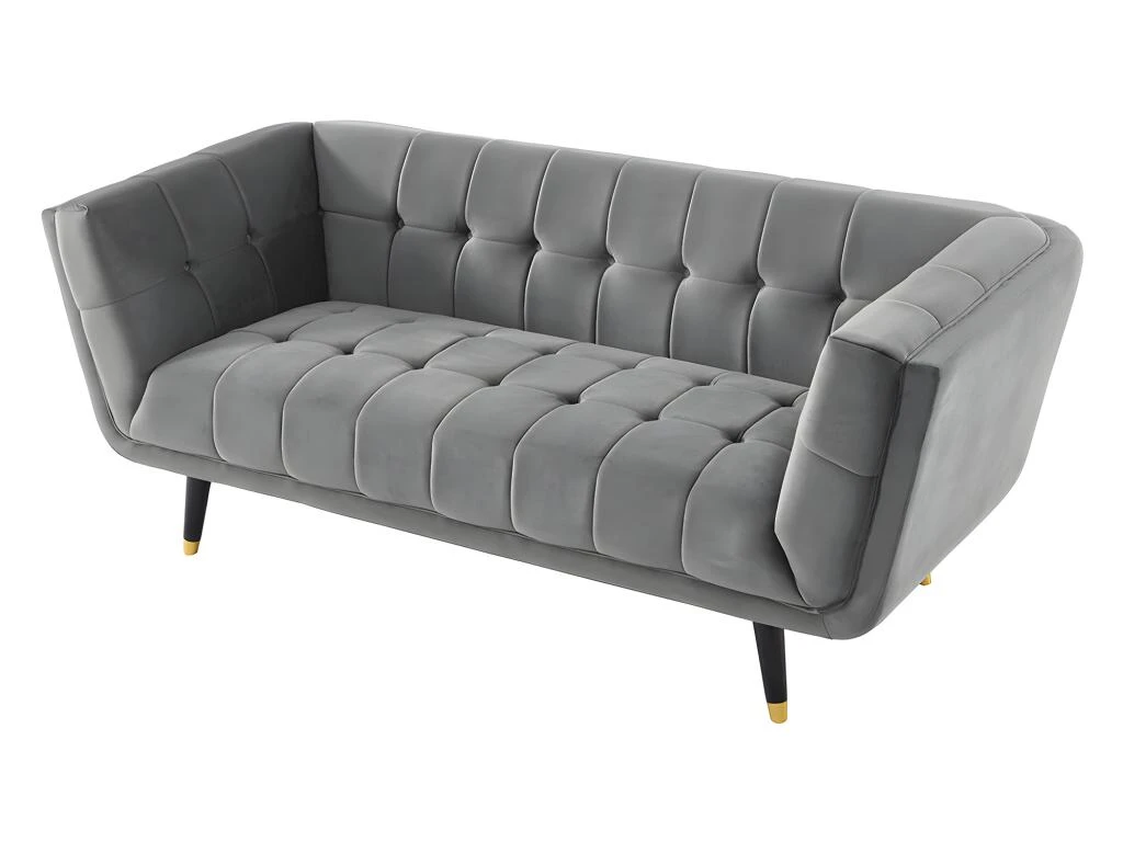 Avec son assise capitonnée en velours garnie de mousse polyuréthane haute résiliance, ce canapé est une véritable invitation à la détente ! Son capitonnage lui donne un look élegant et cosy. Ses pieds noir avec une pointe dorée apporte une touche tendance.