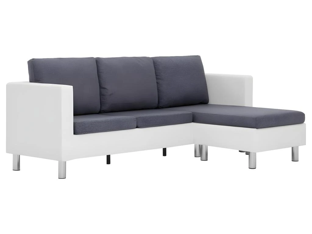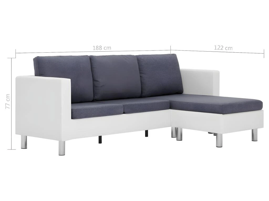 - Couleur : blanc (canapé) et gris foncé (coussins)