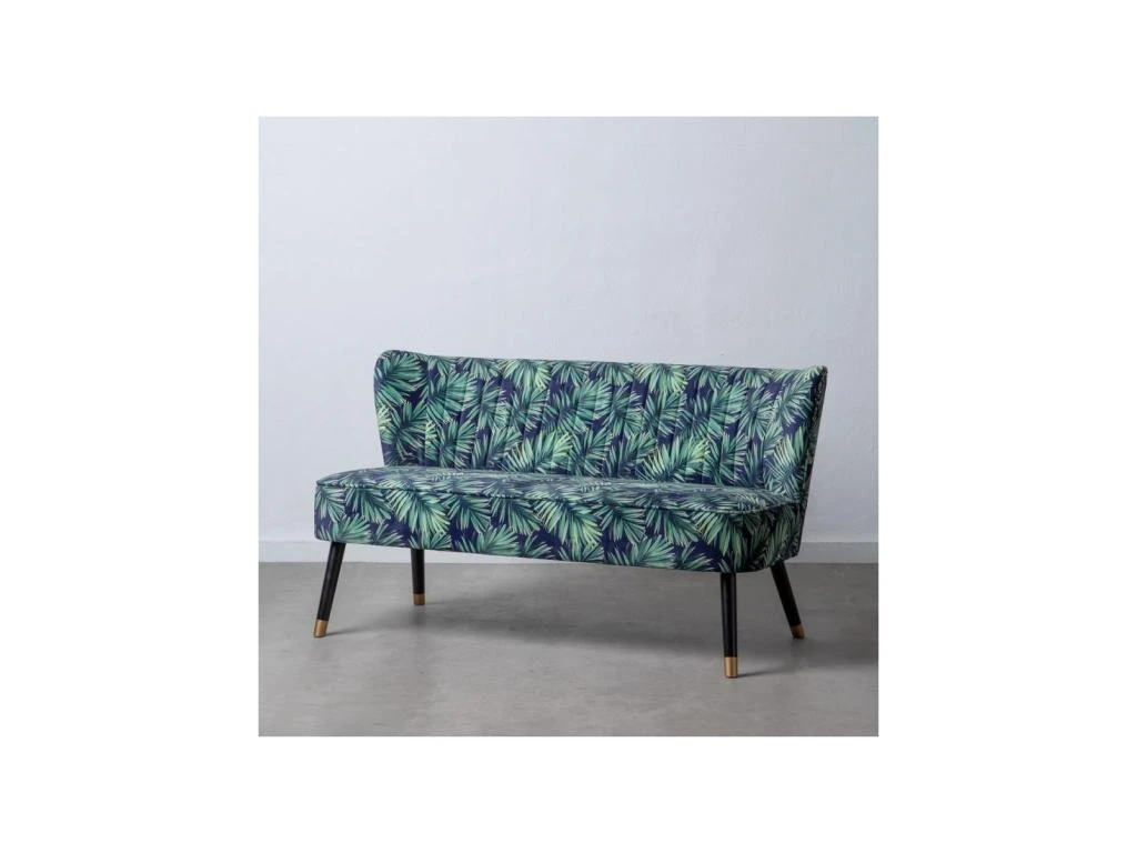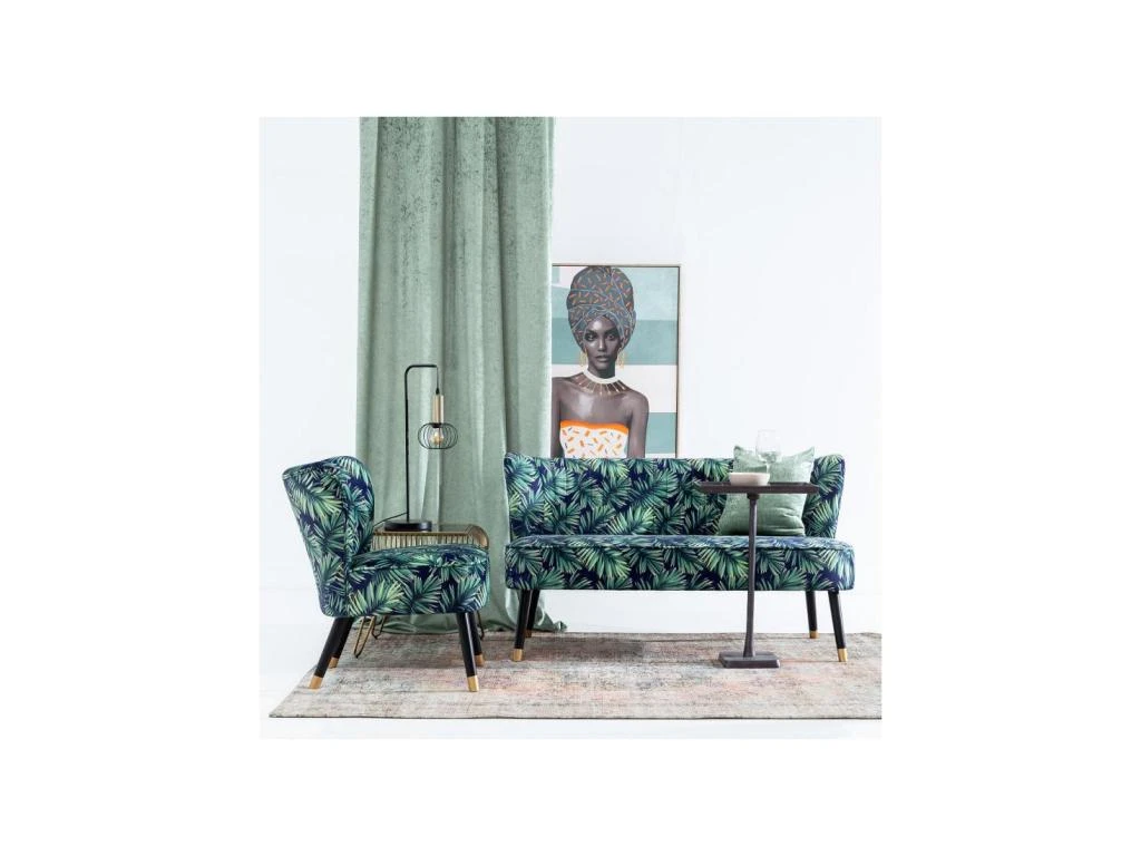 Donnez du peps à votre salon avec ce canapé d’appoint inspiré des meubles Rétro et mettant an avant un tissu Velours Bleu à motifs feuilles.