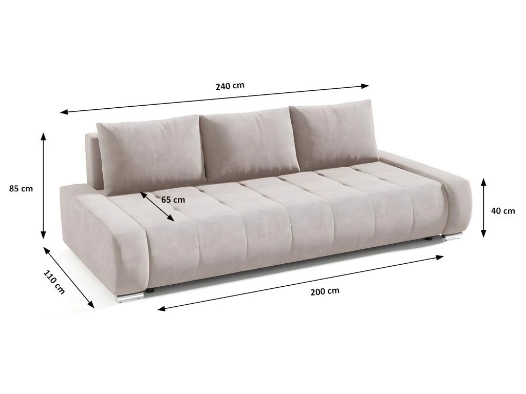 Dimensions : Canapé : 240 x 110 x 85 cm – Couchage : 200 x 160 cm – Hauteur d’assise : 40 cm – Profondeur assise avec coussin : 65 cm