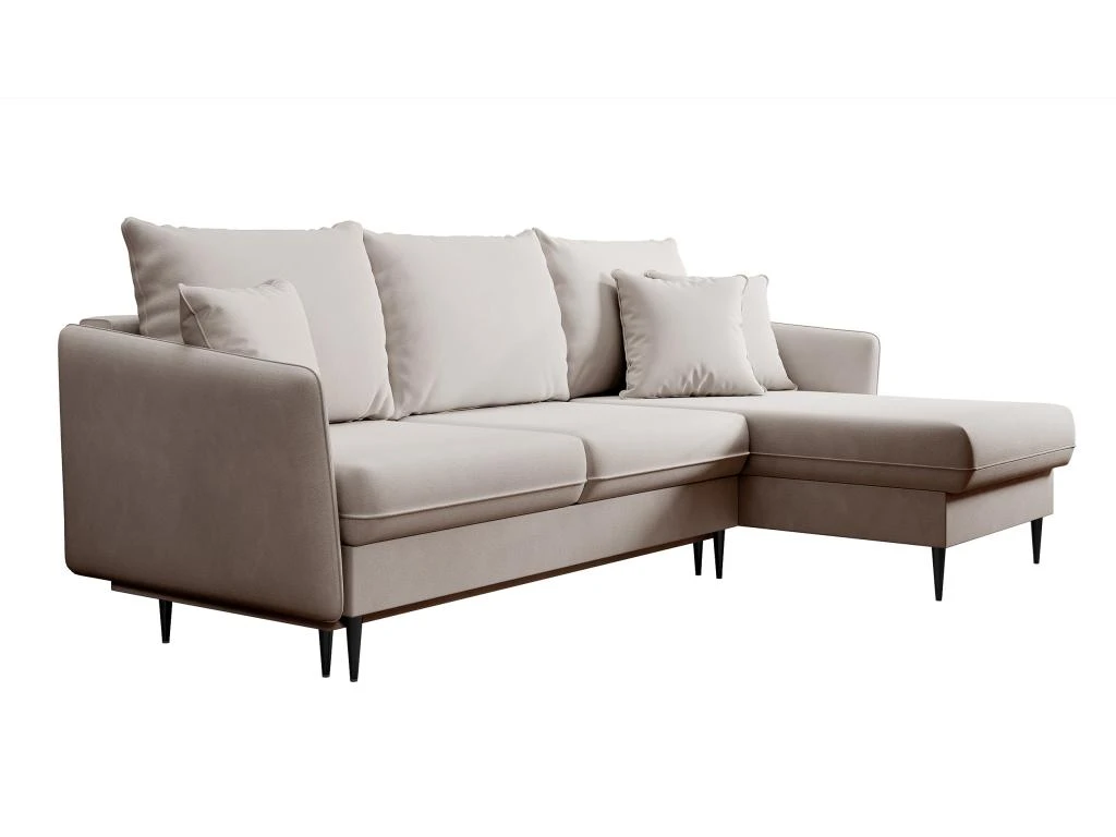 Le canapé d’angle Volio est une proposition qui suscite l’admiration par sa forme minimaliste, dans laquelle on peut clairement voir l’inspiration tirée de solutions de design classiques. Les coussins du dossier, hauts et rectangulaires, soutiendront votre dos de manière adéquate et le dossier confortable vous permettra de prendre un repos bien mérité. L’interieur de ce meuble est rempli de mousse et de ressorts ondulés, de sorte qu’il est suffisamment souple pour être extrêmement agréable à utiliser, mais aussi suffisamment flexible pour ne pas se déformer. Grâce à la fonction de couchage intégrée basée sur le système pratique de dépliage DL, vous pouvez facilement transformer le meuble en un lit spacieux sur lequel vous pouvez accueillir vos invités ou organiser une réunion dans un groupe plus important.