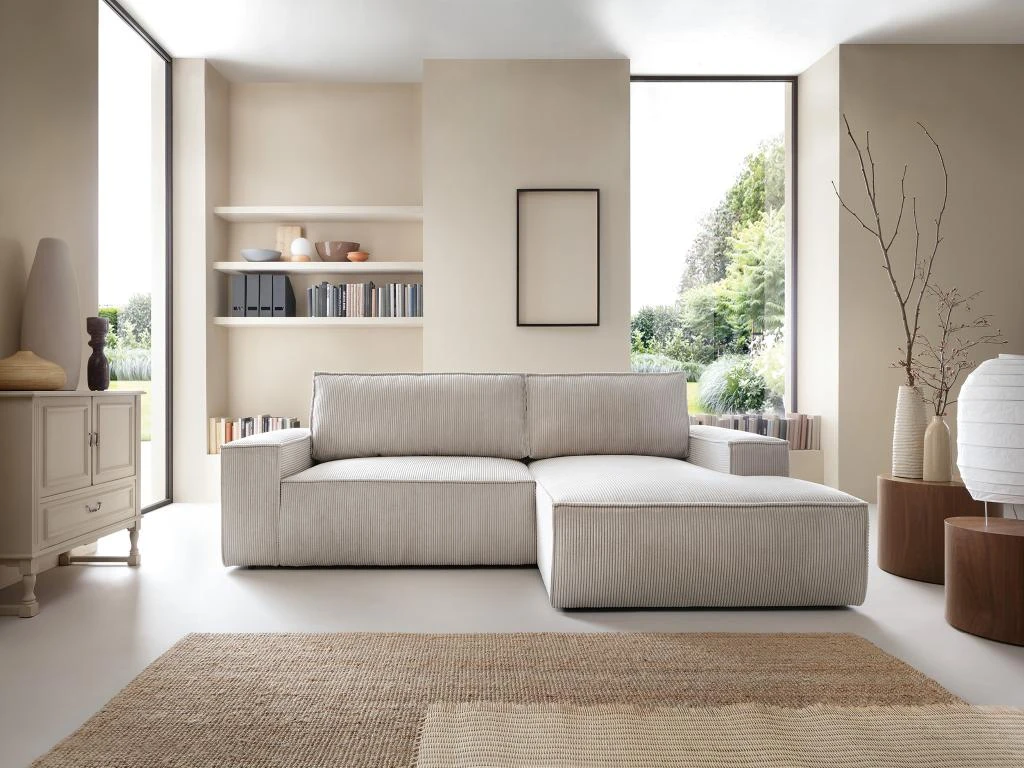 Le canapé d’angle convertible AMELIA en velours côtelé est la pièce qui viendra sublimer votre salon grâce à son élégance et à l’accueil doux et confortable qu’il vous offrira. Ce modèle est aussi très fonctionnel. Convertible et pratique, vous pourrez le transformer en un couchage supplémentaire très rapidement et aussi ranger vos affaires dans le coffre sous l’assise.
