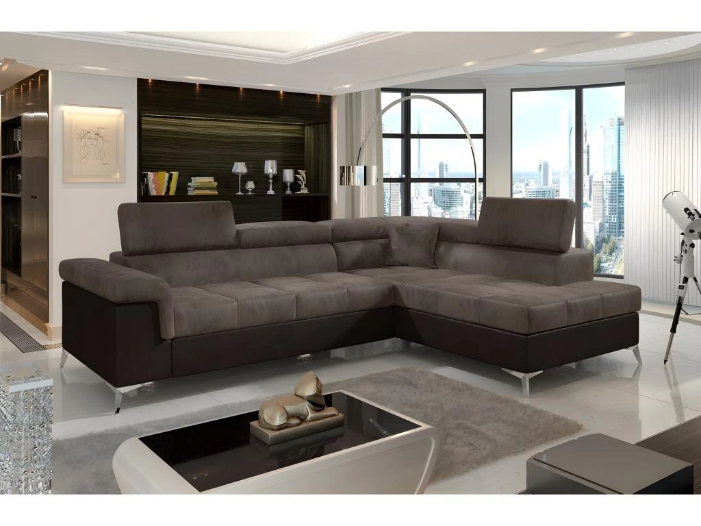 Ce superbe canapé d’angle convertible en tissu de haute qualité – ERIKA – C’est le parfait moyen pour réussir sa décoration intérieure et profiter d’un confort très agréable. Confort et design élégant ainsi que son grand espace de couchage sont les atouts de ce canapé pour combler les plus exigeants. Ce canapé d’angle de style contemporain conçu pour répondre aux plus hauts niveaux de confort. Tissu velours très doux et de la catégorie luxe. Assise très confortable grâce à son excellent rembourrage. Très bonne qualité de fabrication. Fabrication européenne. Tissu de la catégorie la plus élevée. Avec ses jolis pieds en métal chromé poli. L’assise spacieuse, le dossier ergonomique avec appuie-tête réglables et un large accoudoir vous procureront des moments de détente dans le plus grand confort.