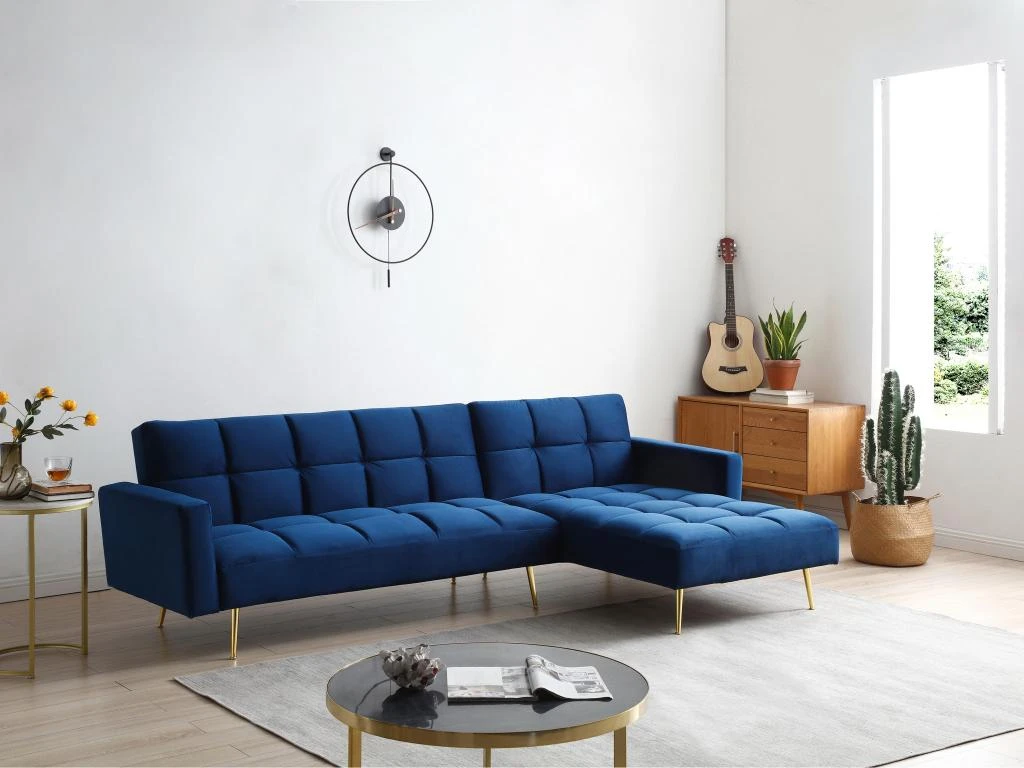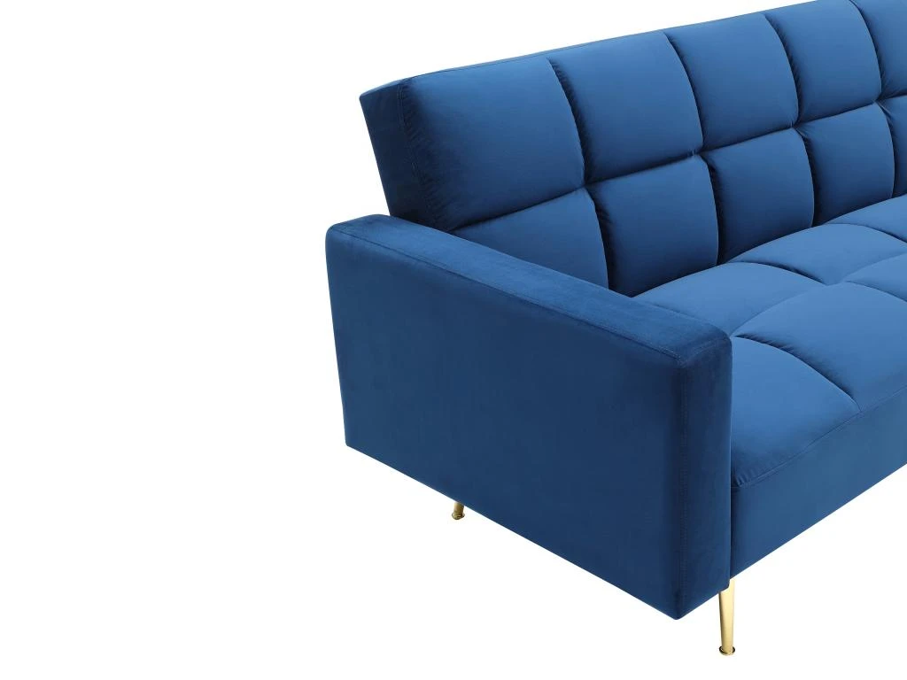 Vous souhaitez transformer votre intérieur avec élégance et fonctionnalité ? Cédez à la tentation du canapé convertible réversible clic-clac en velours NIETO. Son style Art Déco réhaussé d’un piètement en métal doré apportera une touche élégante à votre espace, tout en offrant une solution pratique pour accueillir vos invités. L’effet matelassé de ce canapé ajoute un esthétisme et un confort idéal à l’assise !