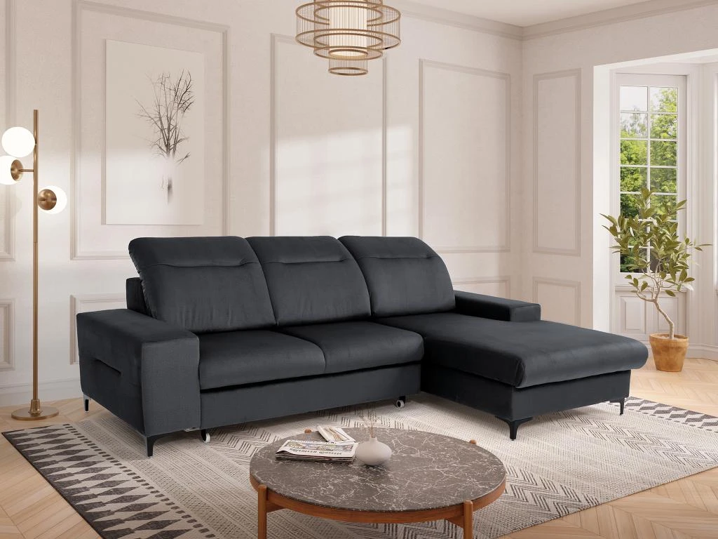 Vous avez envie d’un canapé à la fois pratique et confortable ? N’hésitez plus et adoptez le canapé SANTANA ! Avec son style contemporain et ses couleurs modernes, ce canapé ajoutera une touche tendance à votre salon. Il offrira un confort maximal grâce à son revêtement en velours et ses têtières relax. Vous pourrez également transformer ce canapé en un couchage de manière simple et rapide. Profitez également de son coffre de rangement discret situé sous la méridienne.