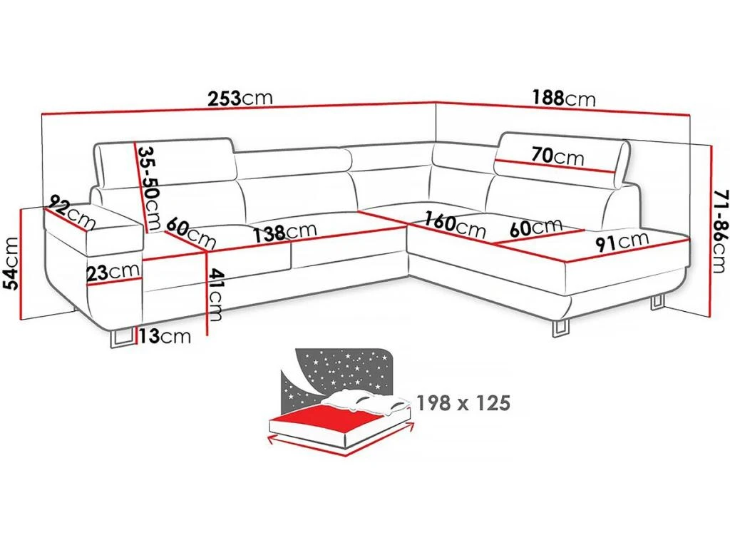 Hauteur : 71 cm avec têtière baissée et 86 cm avec têtière relevée.