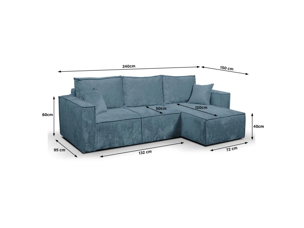 Dimensions : Canapé : 240 x 95 – 150 x 72 cm – Couchage : 200 x 135 cm – Hauteur d’assise : 40 cm – Hauteur accoudoir : 60 cm – Largeur méridienne : 72 cm