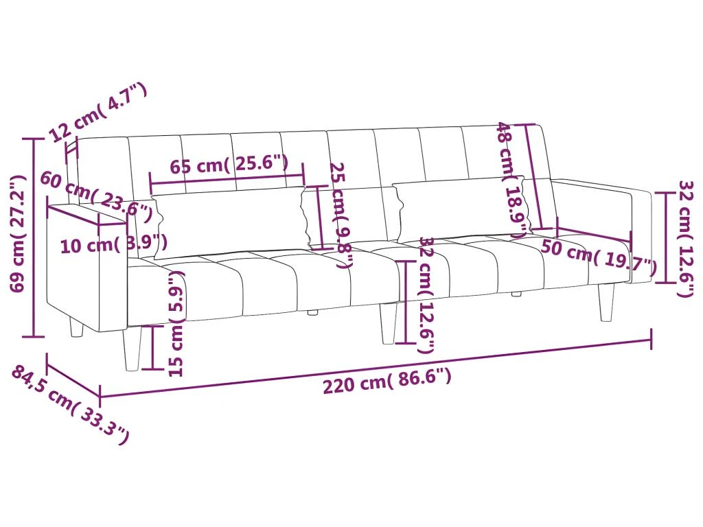 - Dimensions totales du canapé : 220 x 84,5 x 69 cm (L x l x H)
