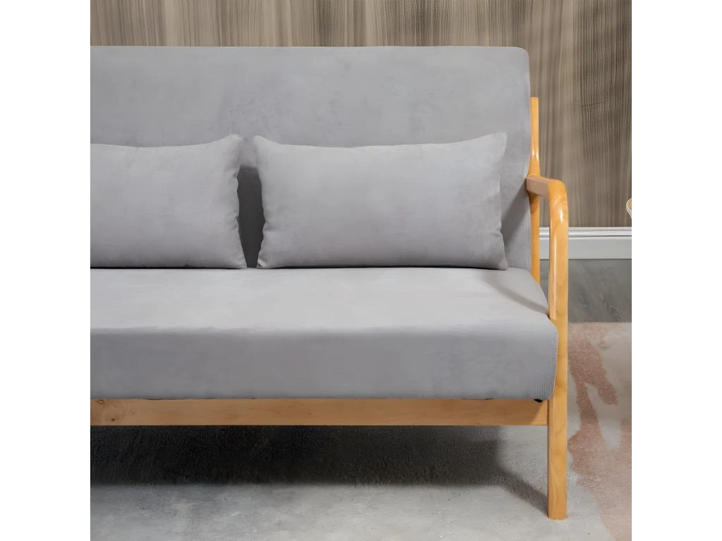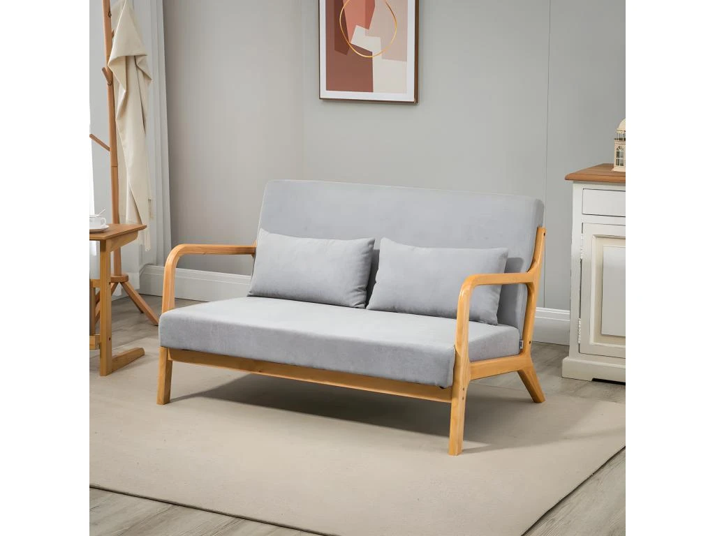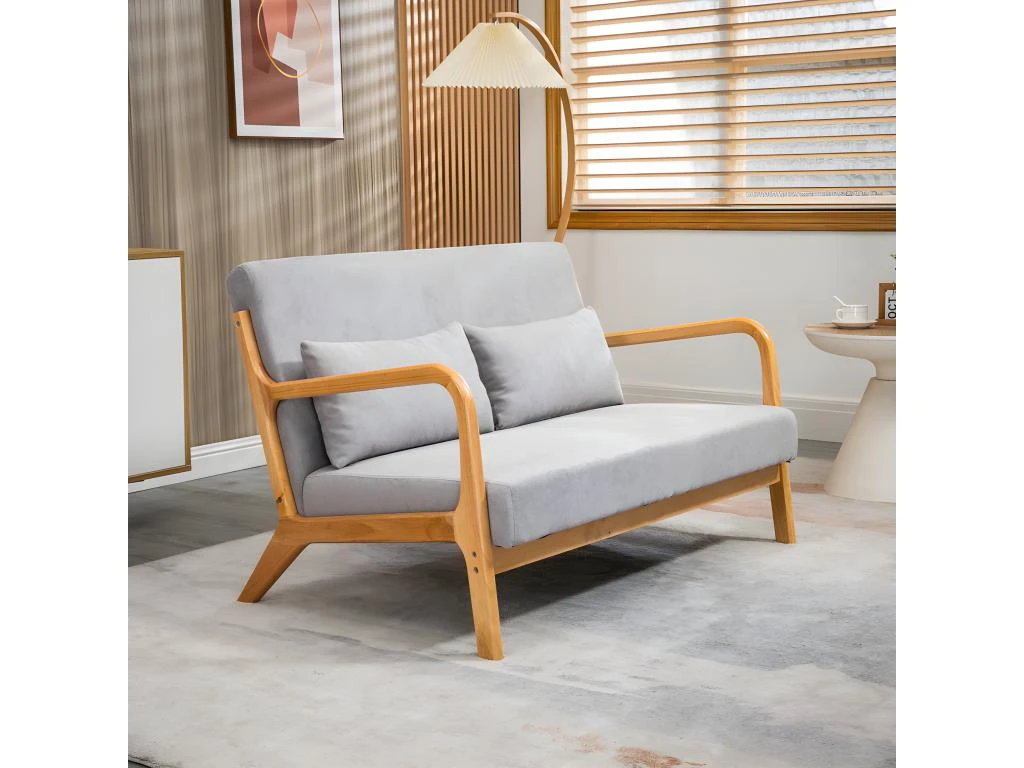 – Canapé lounge 2 places avec structure en bois d’hévéa et coussins aspect velours gris idéal pour plonger votre intérieur dans une atmosphère coccooning