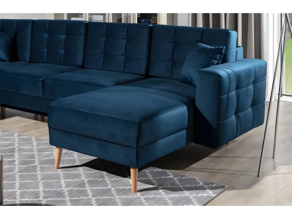 La disposition en forme de U panoramique offre beaucoup d’espace pour se détendre, car le canapé mesure 320x202x90 cm. Il répondra aux attentes de détente jour et nuit. Il peut être transformé en lit facilement avec une surface de couchage de 120×282 cm, très pratique grâce au système d’ouverture très simple. Son assise très confortable notamment grâce aux ressorts continus doublés de mousse 30 kg/m3, contribue également à la qualité de sa structure et de son confort, offrant un soutien optimal du corps et un soulagement de la colonne vertébrale. Pour améliorer encore le niveau de confort, les dossiers profilés sont équipés d’un dossier rembourré et fixé par Velcro, cela vous permet de régler l’angle de courbure pour votre dos.