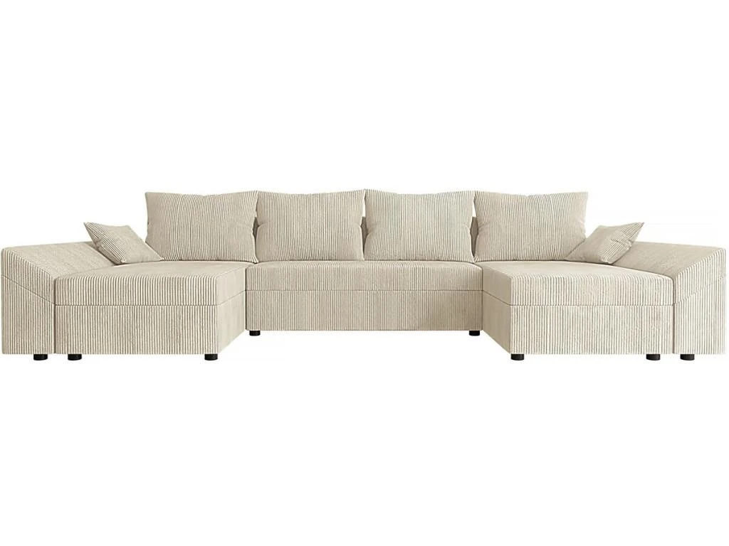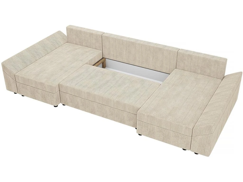 Descriptif : Canapé d’angle panoramique en velours côtelé avec coffre Dante en U – 316 x 138 x 82 cm – 4 coussins de dos – 2 coussins d’accoudoirs – Beige.