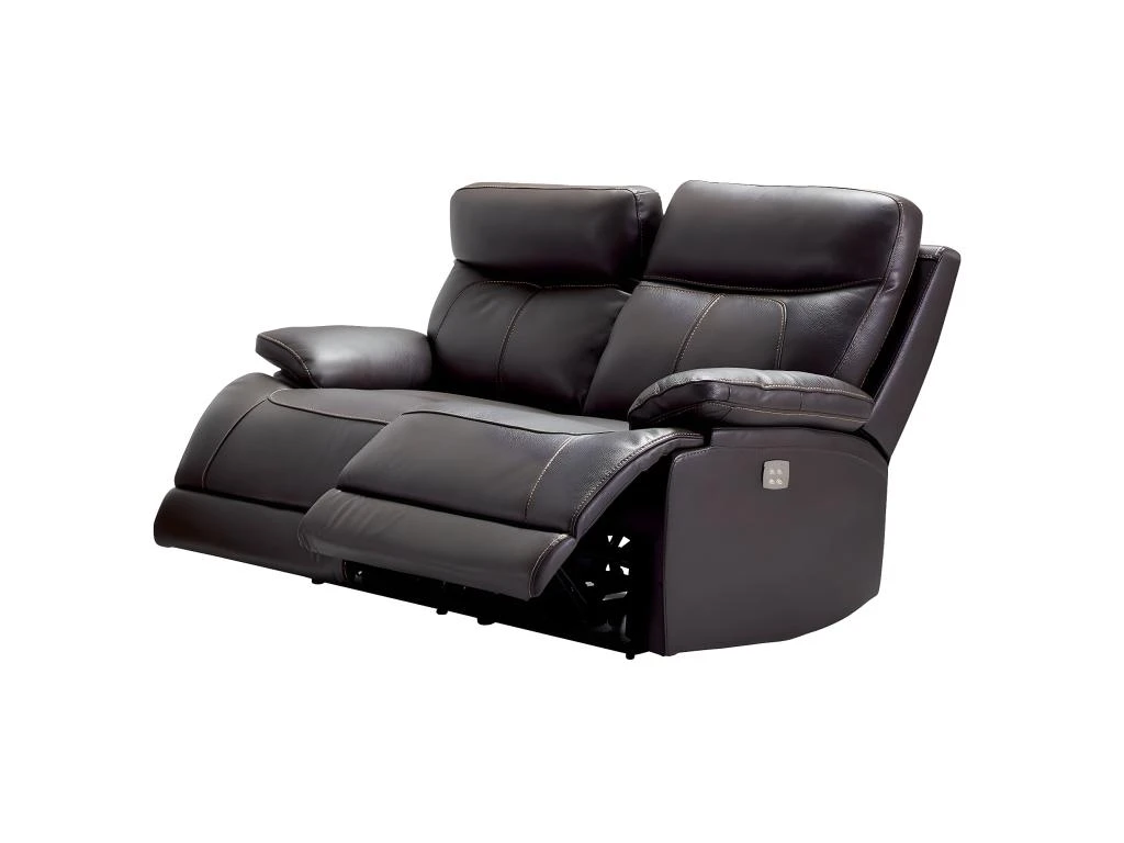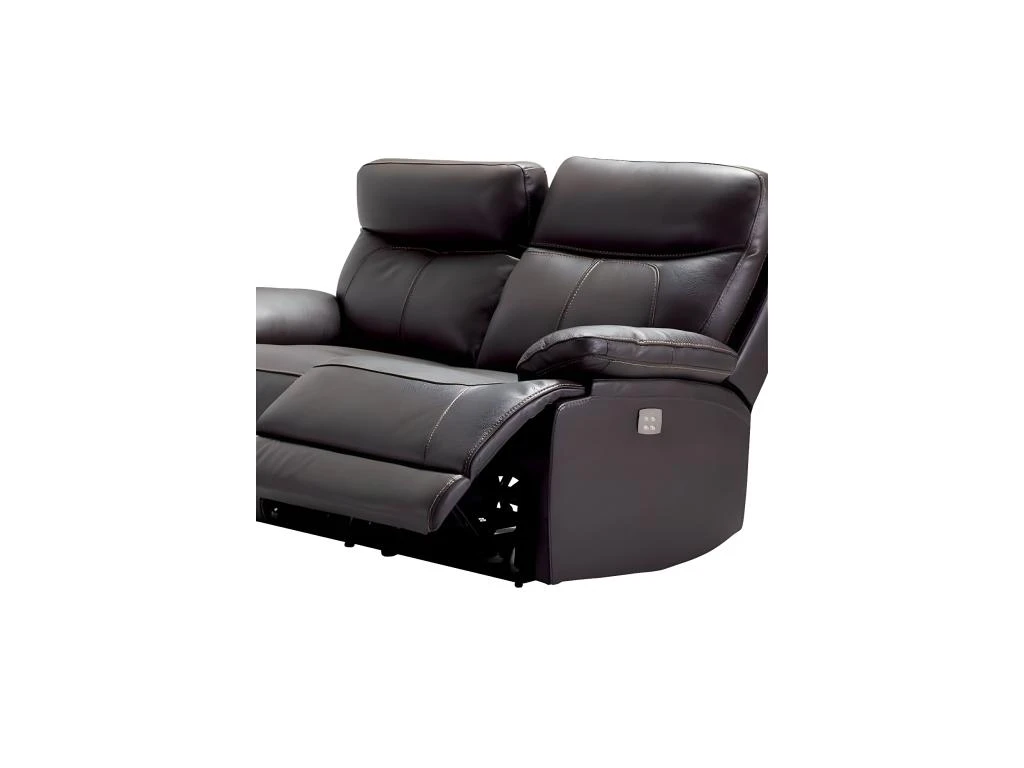 Un canapé au look contemporain en cuir marron foncé avec des surpiqures orange. Possède une fonction relax électrique pour un confort optimal une fois rentré chez vous.